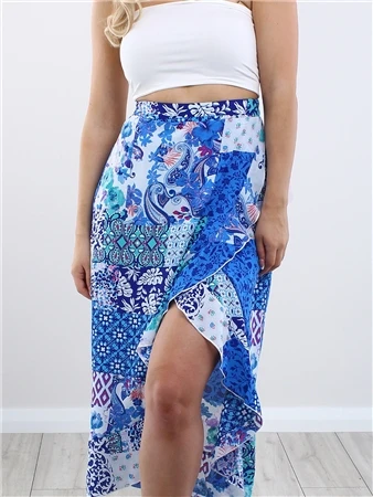 Girl In Mind Blue Emily Patchwork Frill Detail Wrap Skirt