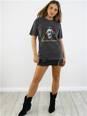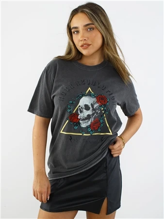 Missi London Acid Wash Charcoal Skull Rose Print T-Shirt
