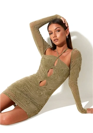- In a green animal print, it features a bodycon mini fit with cutout detailing and long sleeves