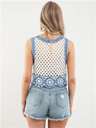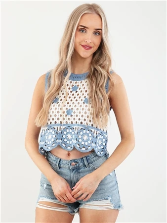 Qed Blue / White Crochet Flower Sleeveless Top